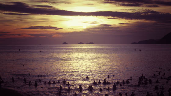 Mig per casualitat, passejant per Ipanema el dia 1 de Gener de 2014, vam poder veure aquesta espectacular posta de sol i coincidir amb tantíssima altra gent que hi havia anat expressament. La Pedra d’Arpoador és un lloc ideal per veure pondre’s el sol al mar, i que coincideixi que ho fa dins l’aigua són uns pocs mesos a l’any, al voltant de desembre. Aquí és estiu i els dies són llargs. Quan el sol toca a l’aigua, o s’amaga darrera els núvols baixos i desapareix, la gent comença a aplaudir i xiular celebrant el gran moment… i hi ha moooolta gent!! Alguns ho aprofiten per remar les últimes onades de la tarda, nedar, o simplement refrescar-se després d’haver superat els 40 graus durant el dia.