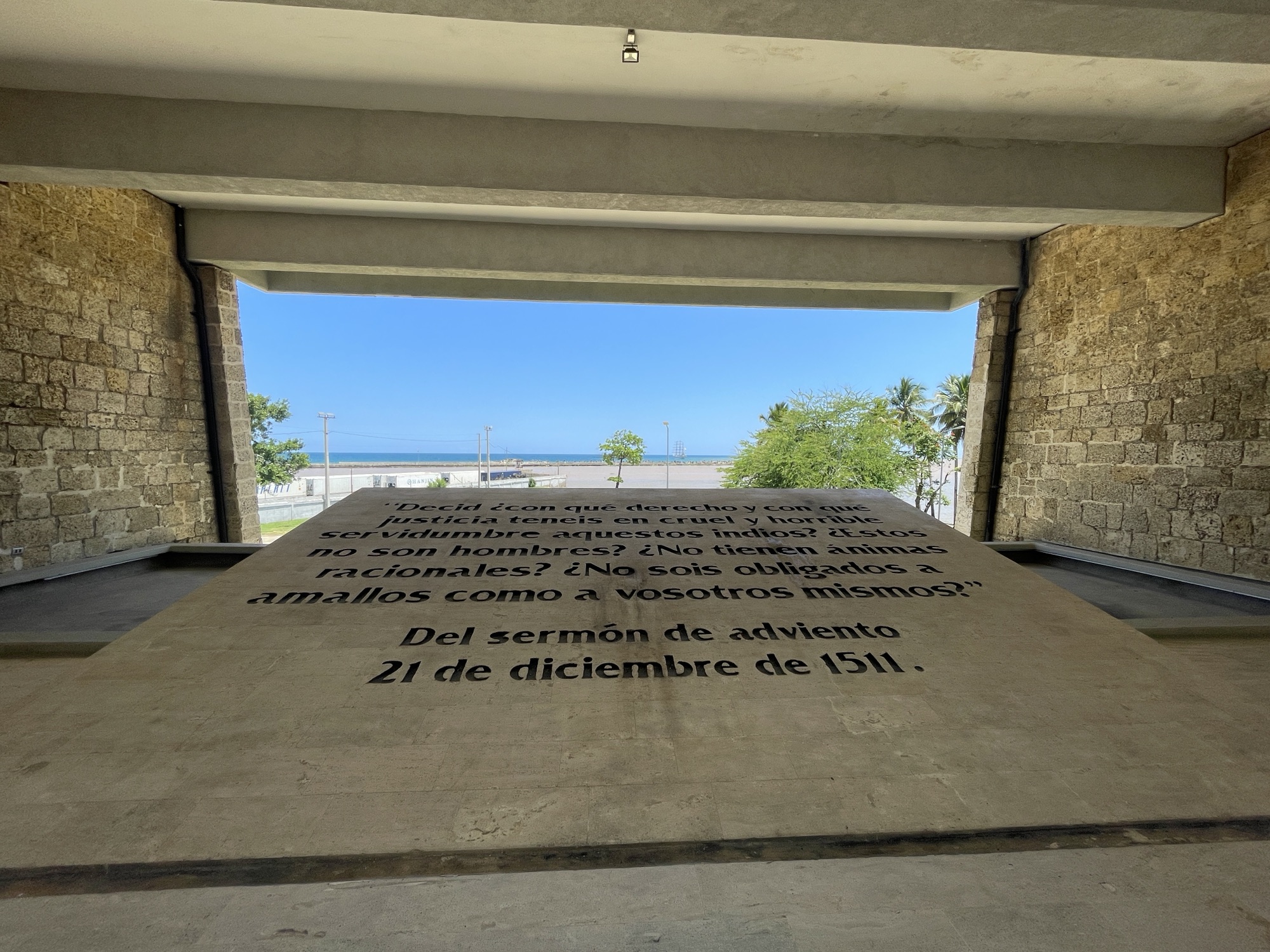 Al peu de la gran escultura de Fray Antonio de Montesinos, hi ha un fragment del sermó de 1511 que es considera una de les primeres aportacions als Drets Humans, reclamant el respecte per als indígenes, explotats per la colonització española.