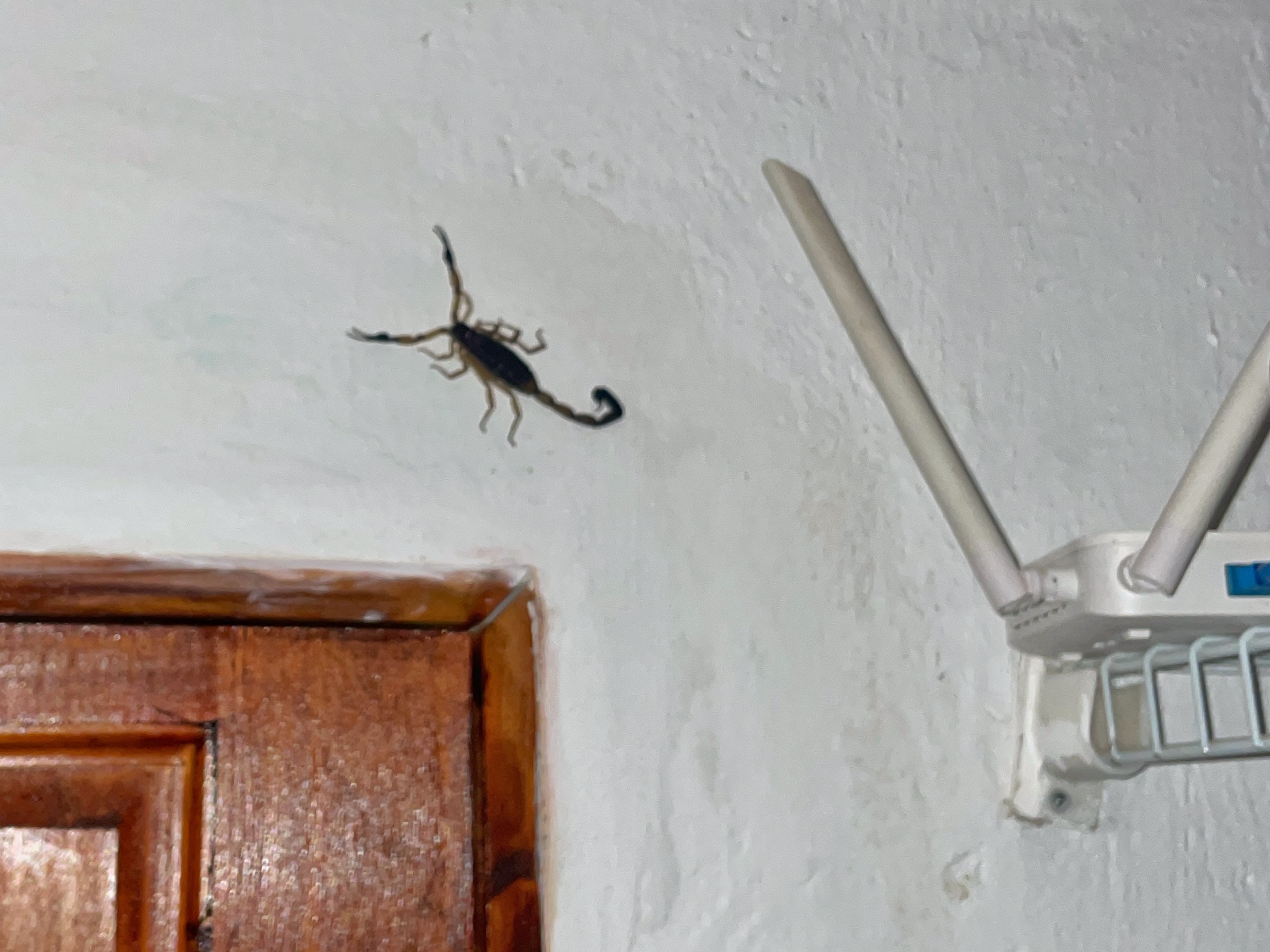 Però quan els nens ja dormien i jo estava tancant els llums, l’animal no identificat que es movia entre el capçal del llit i la porta del bany, resulta ser un escorpí d’uns 7cm de cos. L’ensurt és bastant gran i la intranquil·litat per dormir allà augmenta… em desfaig de l’animal mentre la resta dormen sense haver-se’n adonat. Al matí següent, parlem amb els propietaris i ens diuen que normalment no maten, només si ets al·lèrgic… i per l’històric familiar d’al·lergies d’un membre de la família, decidim canviar de lloc. No sense abans haver buidat TOTES les motxilles, necessers i bosses per assegurar-nos que no ens n’emportem un altre amb nosaltres.