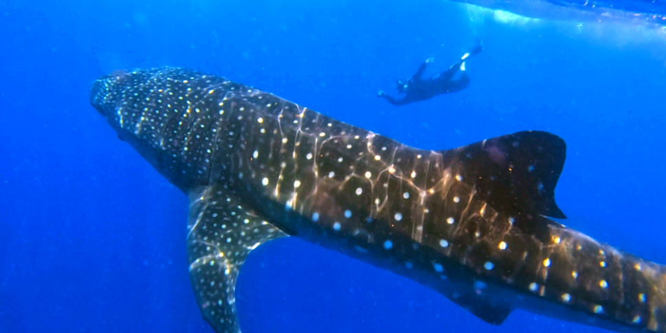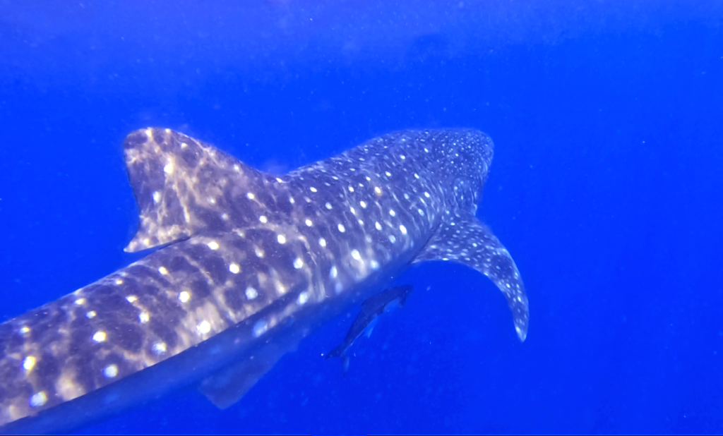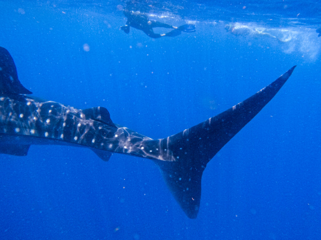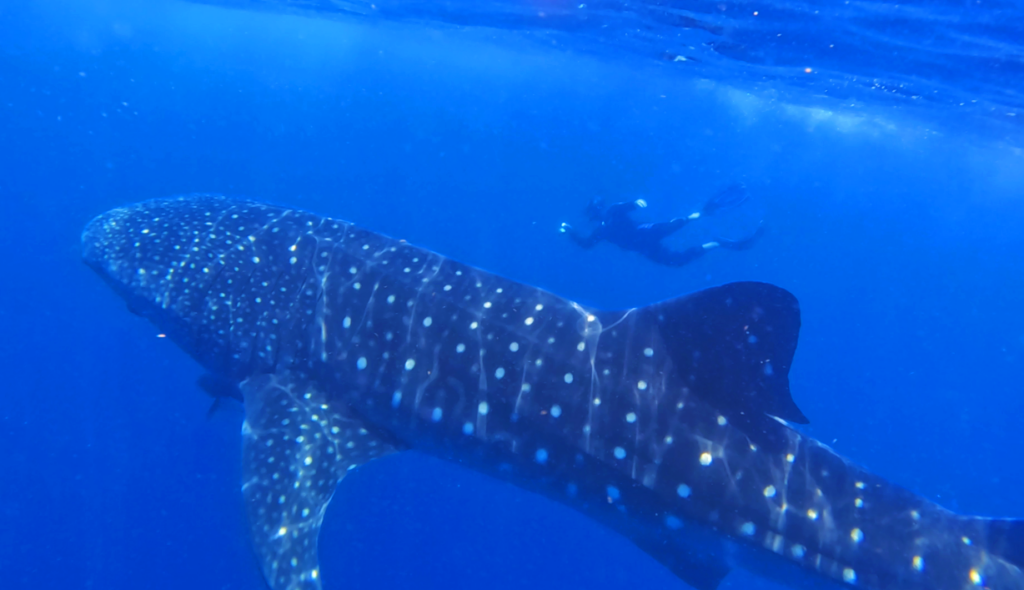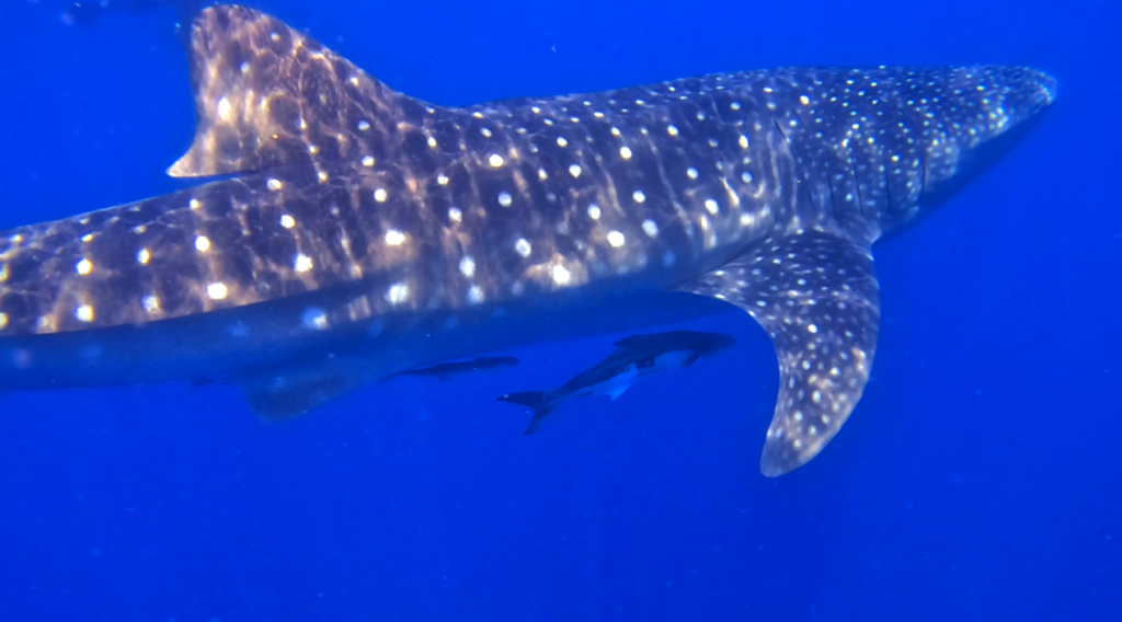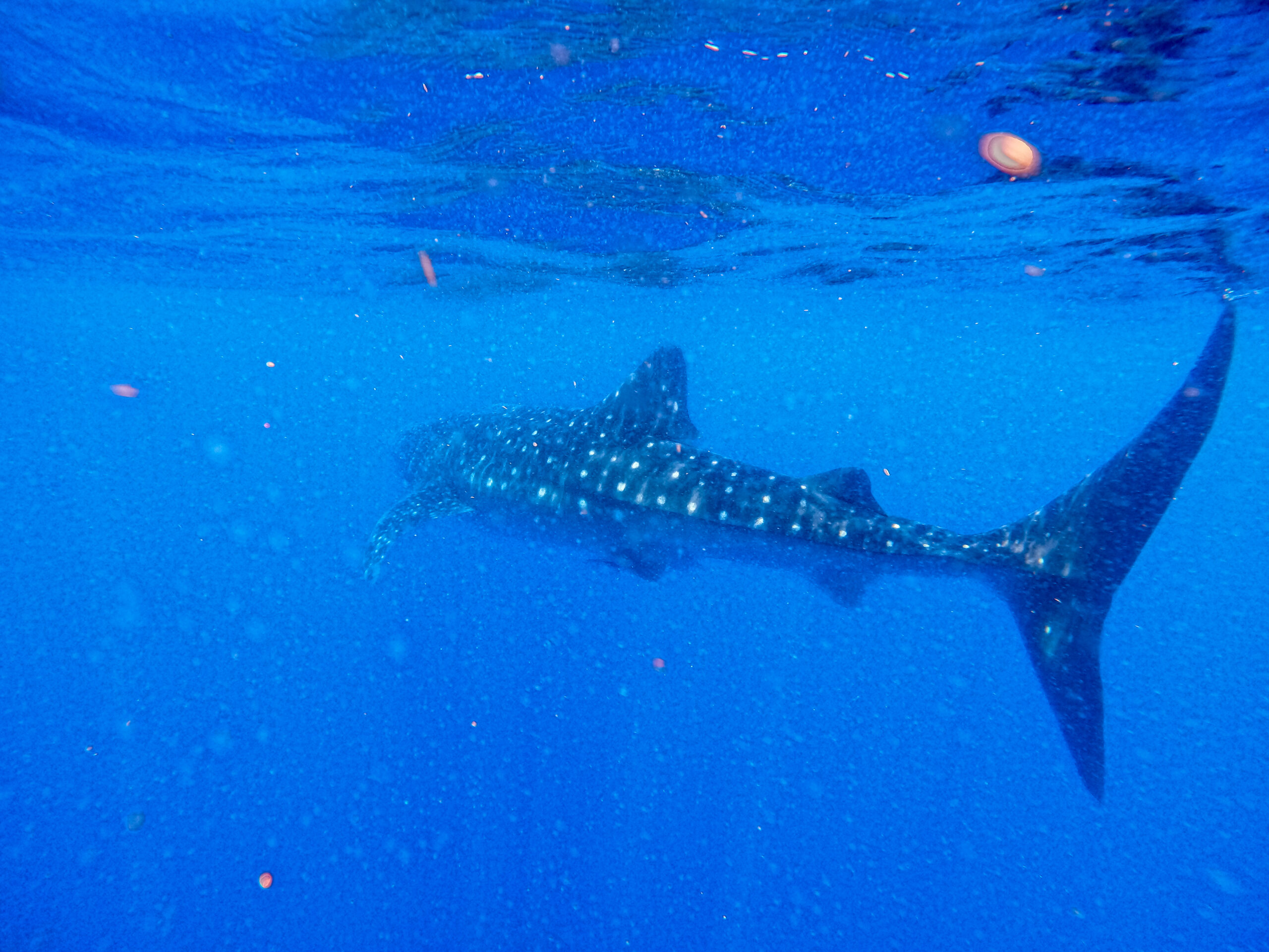 Però l’estrella de l’illa (que desconeixíem 7 dies abans d’arribar) és la possibilitat de veure i nedar amb el tauró balena. El peix més gran del món, que fa entre 7 i 15 metres i s’alimenta de plancton. Una gran barrera de corall que hi ha davant l’illa, fa que de junya a agost, les corrents oceàniques xoquin i aixequin els microorganismes del mar i l’aigua estigui plena d’aquest aliment. Així, hi ha una zona que s’omple de taurons balena.