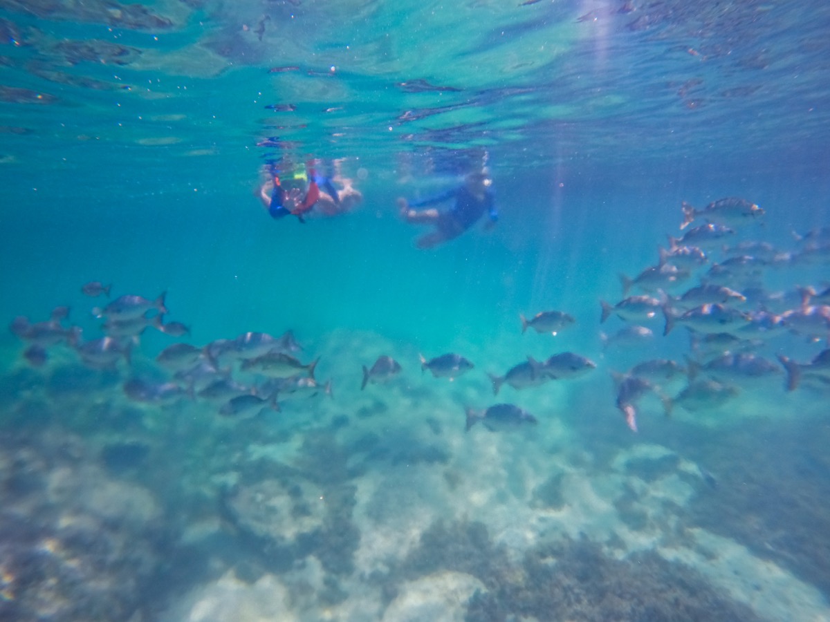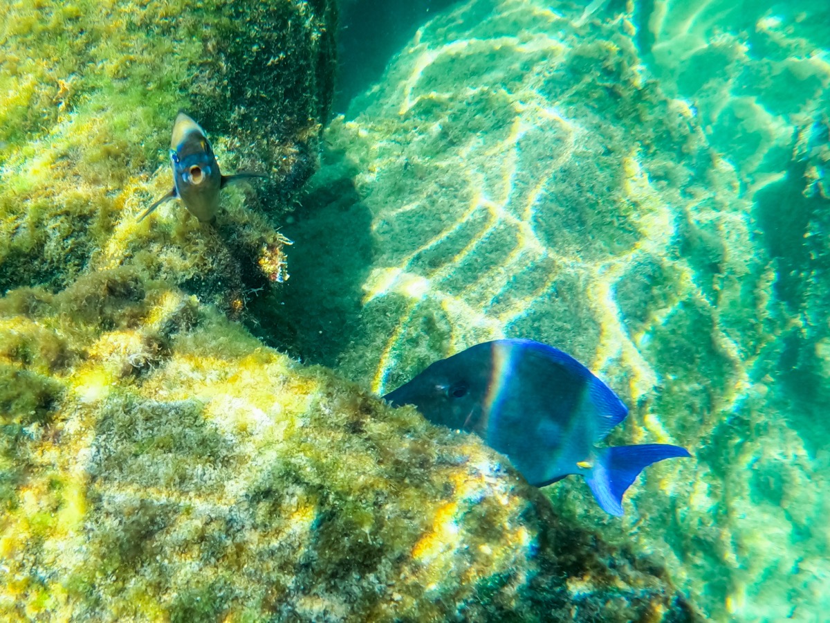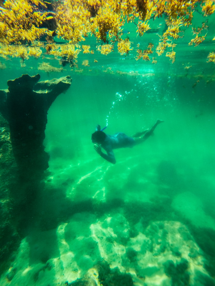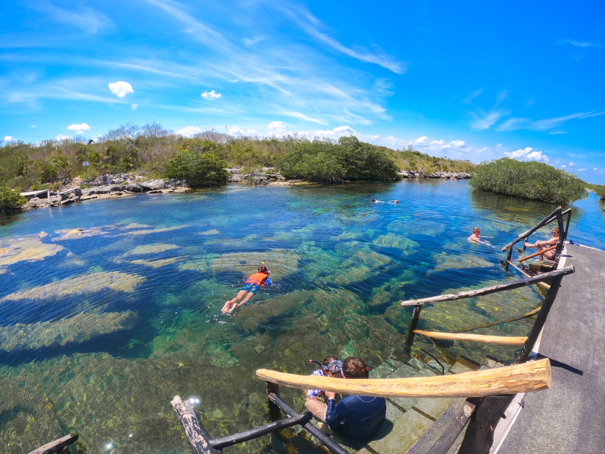 Un dia vam visitar la Laguna Yal Ku, on hi ha un cenote i una llacuna que s’obre al mar, on es pot nedar i fer snorkel en aigua cristal·lina. Vam veure moooolts peixos diferents i nedar entre roques i petites coves.
