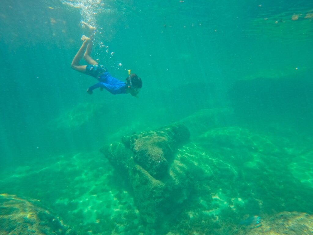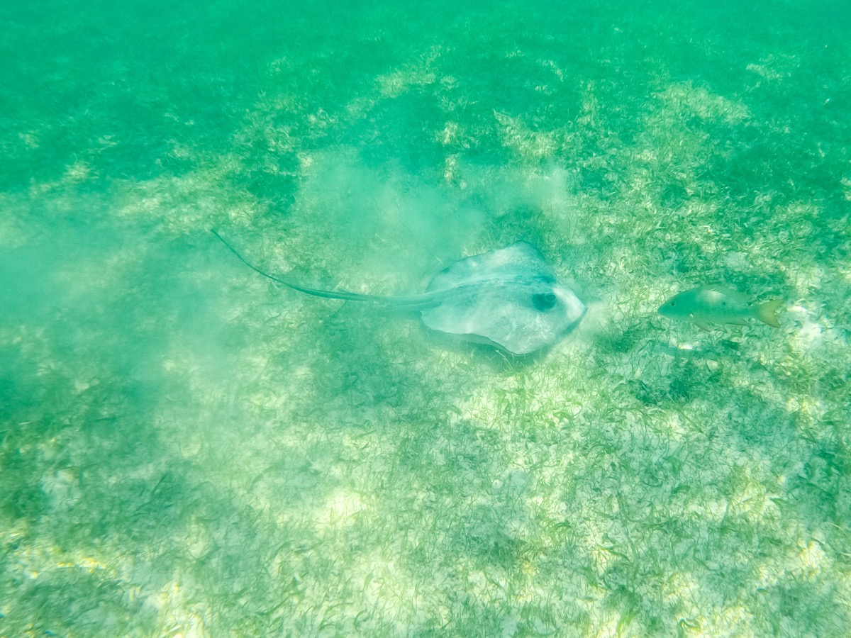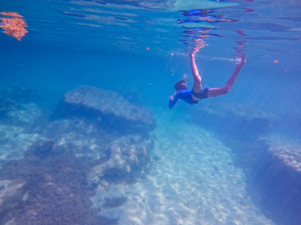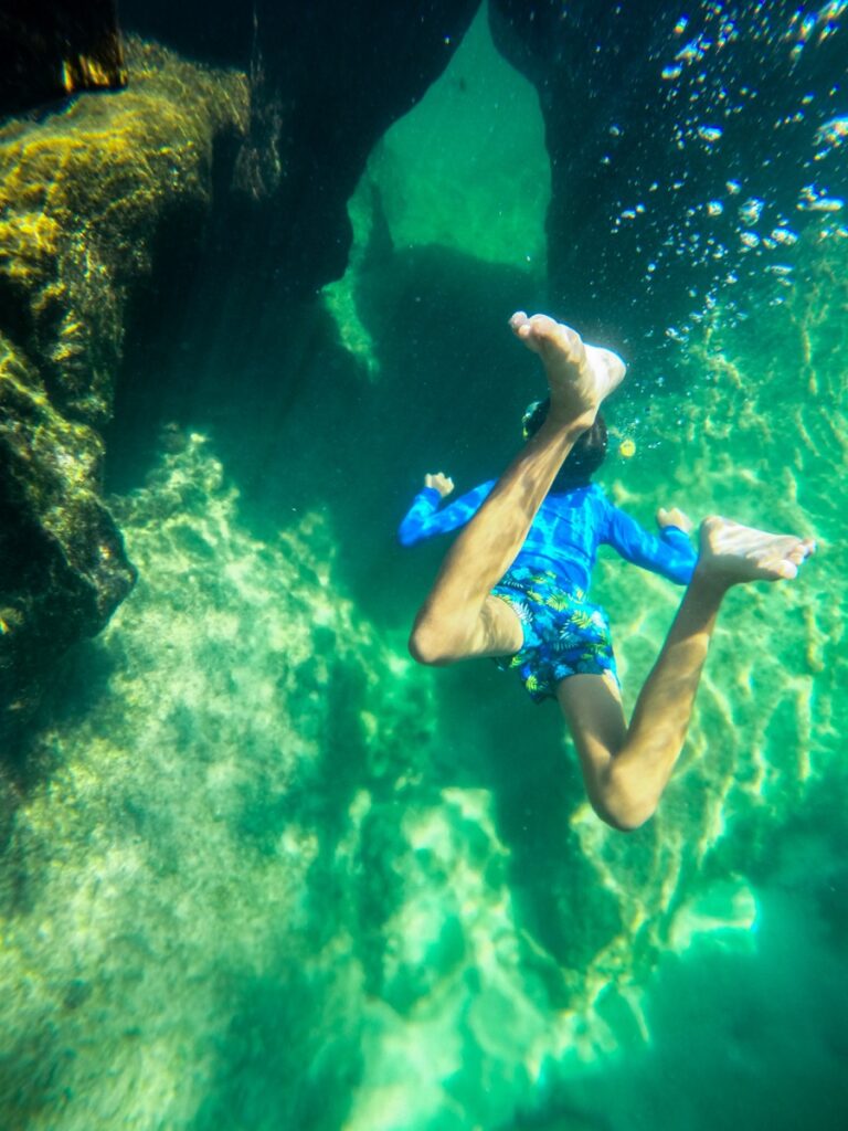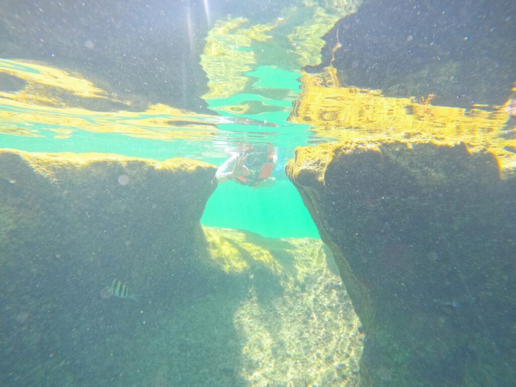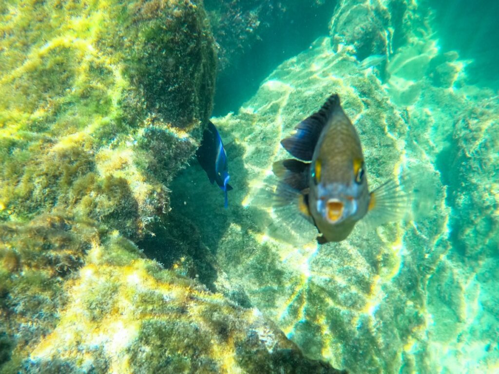 Un dia vam visitar la Laguna Yal Ku, on hi ha un cenote i una llacuna que s’obre al mar, on es pot nedar i fer snorkel en aigua cristal·lina. Vam veure moooolts peixos diferents i nedar entre roques i petites coves.