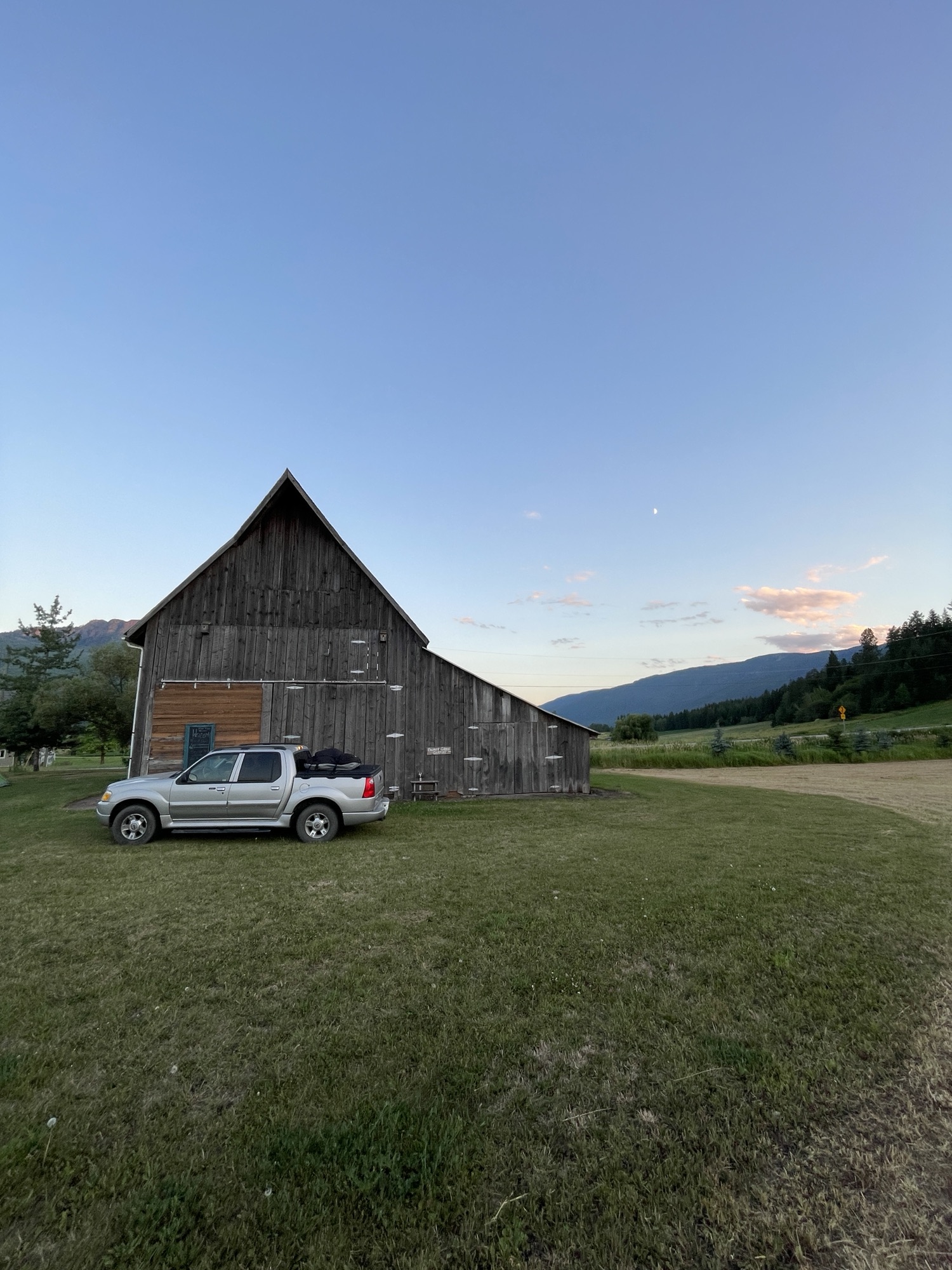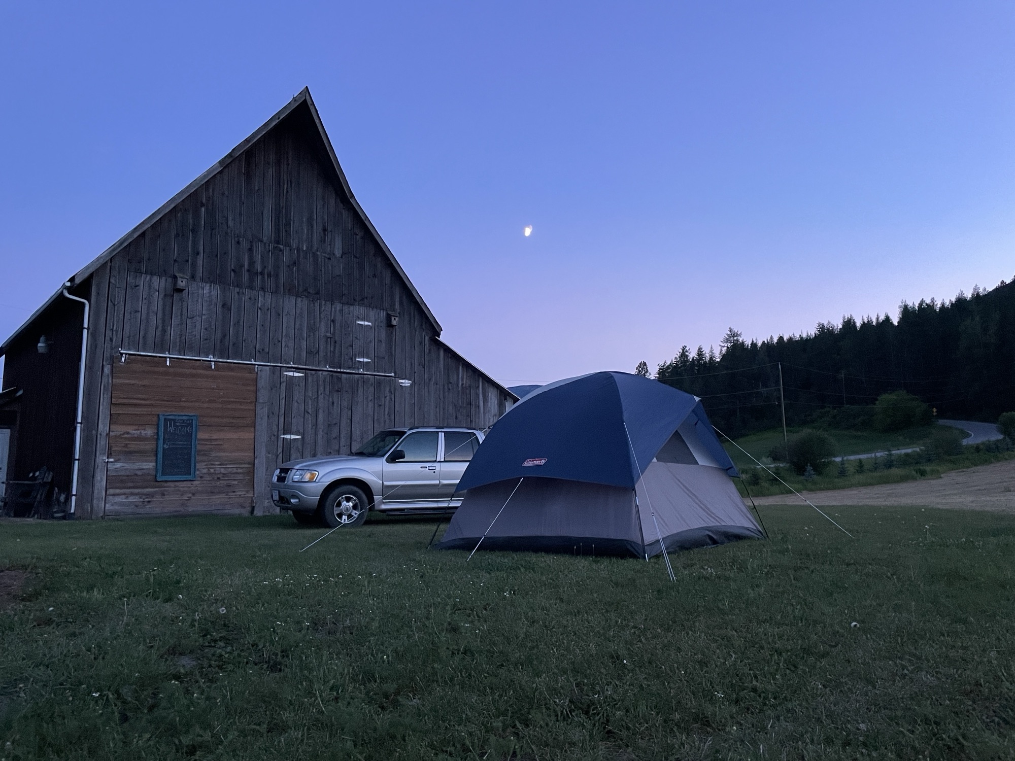 Vam decidir dividir el trajecte de Seattle a Calgary en dos dies. La frontera d’entrada a Canadà va ser tranquil·la i vam seguir conduint fins a Salmon Arm, on una família posa a disposició a Airbnb un camp al costat de la seva granja perquè hi plantis la tenda.