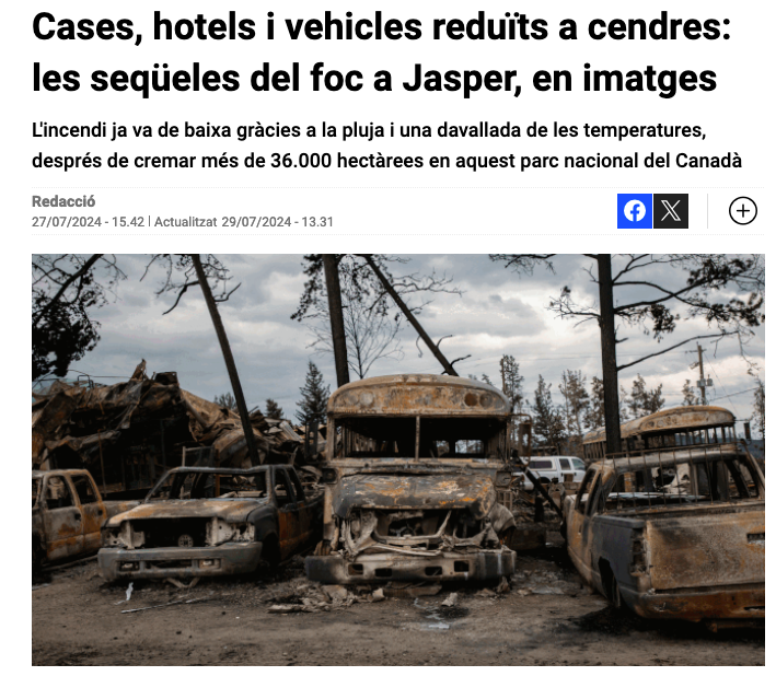Van cancelar totes les reserves de càmpings i tancar el parc com a mínim per 2 setmanes, així que ens toca buscar una alternativa. Les imatges i notícies de l’incendi en els dies següents són esfereïdores i tristes… Molta gent evacuada però sobretot la destrucció fins al mateix poble de Jasper i l’afectació a la temporada d’estiu que això significa per tanta gent que hi treballa.