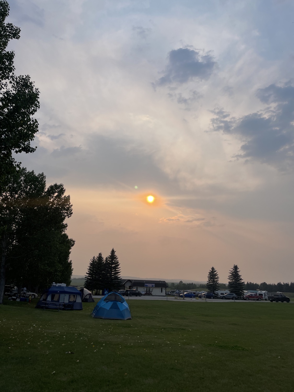 Tot i que el camping sembla un parking de polígon on hi ha des d’una autocaravana autobús que costa mig milió de dòlars, fins a “barraquisme” amb detenció de la policia inclosa, ens serveix de punt de parada per visitar la vall. Tot i estar a 170 km de Jasper, a la tarda plou cendra. De fet, hi ha més de 400 incendis actius a British Columbia i Alberta, degut a una forta tempesta elèctrica 3 dies enrere.